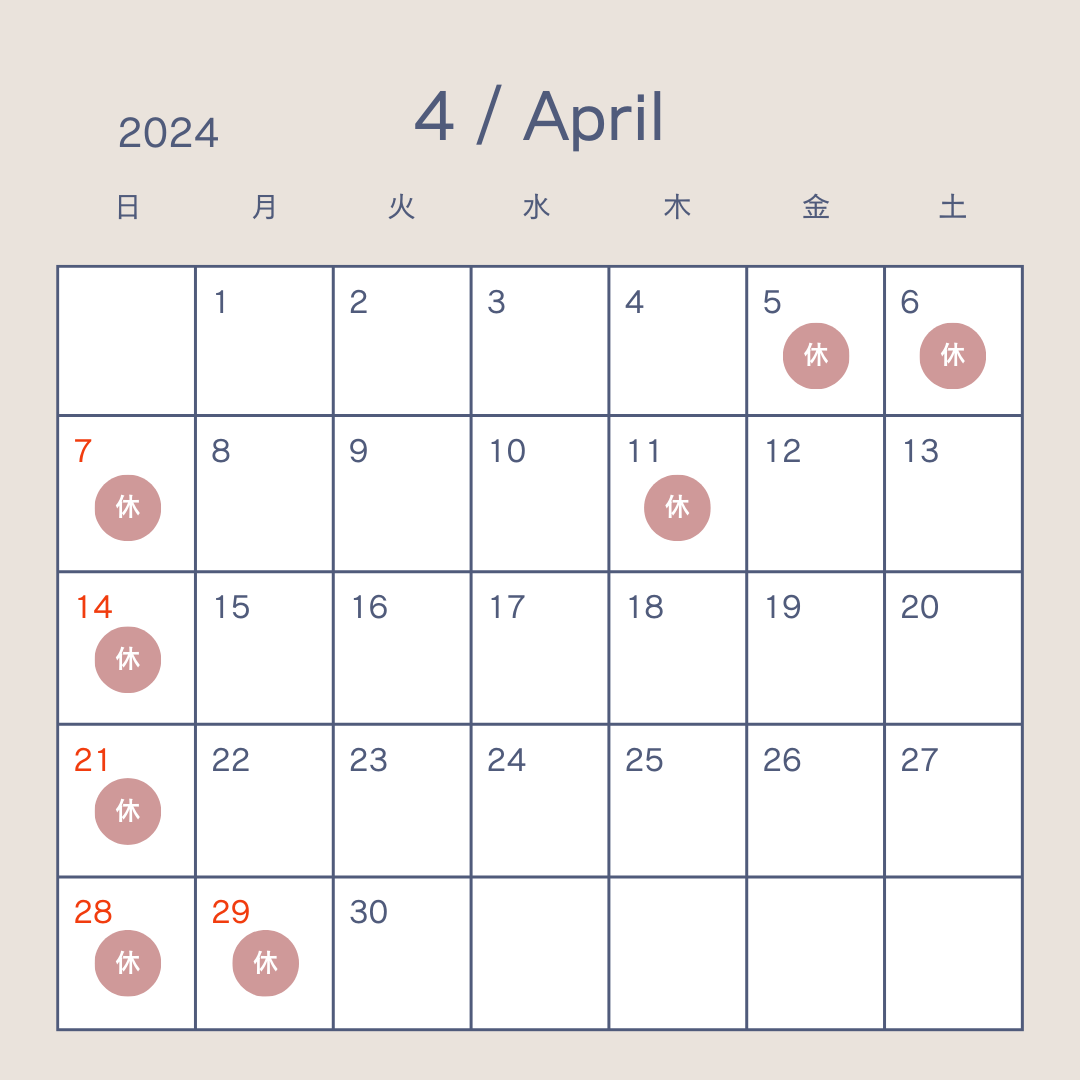 4月の営業日です😊(5月のご予約も受け付けています💡)