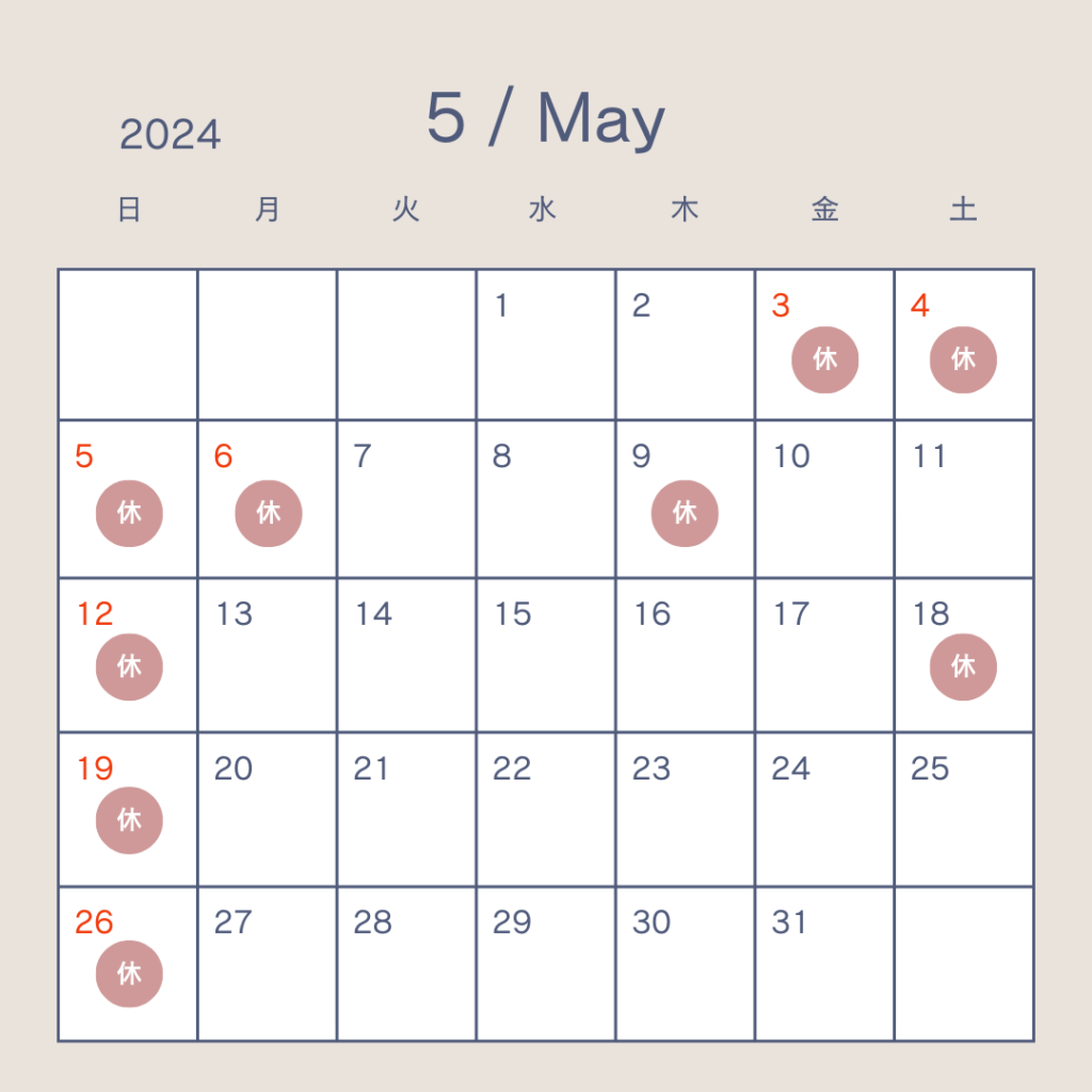 5月の営業日です😊(6月のご予約も受け付けています💡)GWということもあり前半はお休みが多くなります。また土曜日は事前にお問い合わせ頂いた場合のみの営業となりますが、4日、18日はお休みさせて頂きますのでよろしくお願いしますǶ... -