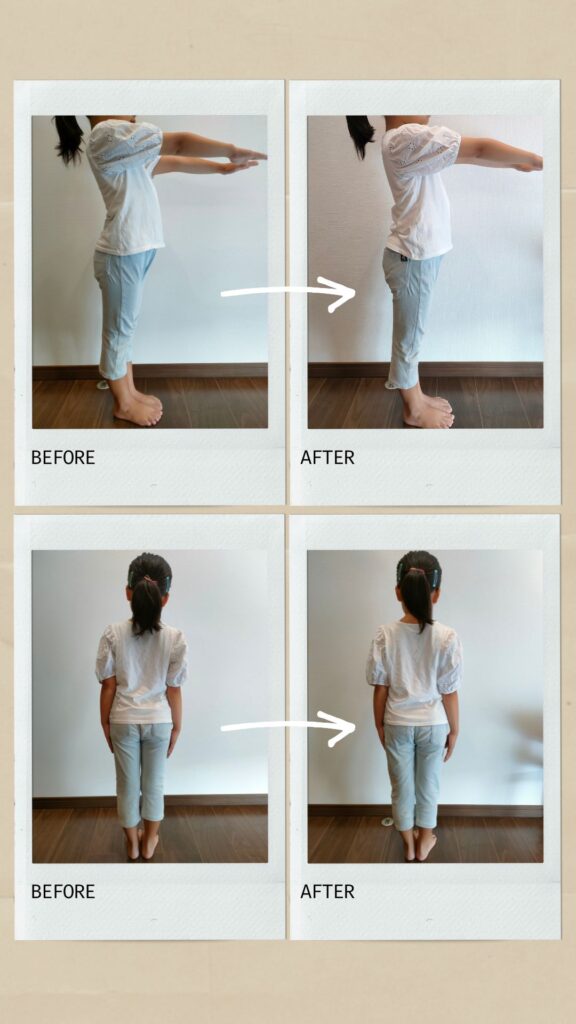 これが一番の問題です。今回は親の要望の元で施術を受けてくれたので仕方ないのですが、小2の娘には”体が歪む”という意味も分からなければ興味も無いので、一時的に良くはなっても普段から正しい姿勢を意識することが難しいというところです😓