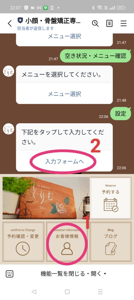 まずLINEのトーク画面を開いて頂き、リッチメニューの①お客様情報をクリック→②入力フォームへをクリックします👇