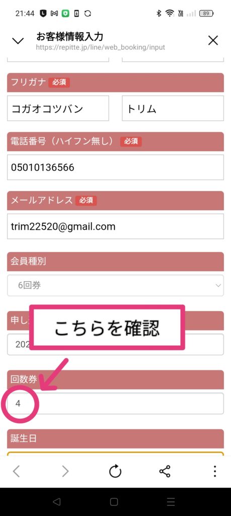 そうすると下記↓の”お客様情報入力”画面が開くのですが、回数券というのが残り回数となります💡