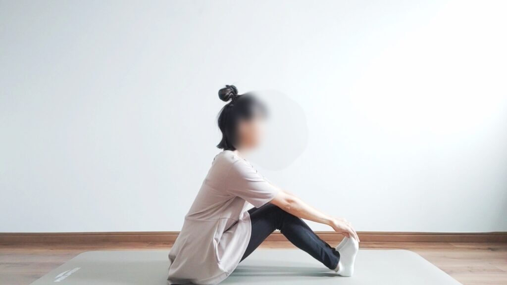 ・体育座りでつま先を天井にむけ、両手でつま先を上から掴みます